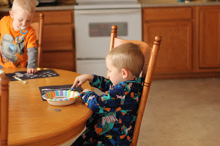 First we had to paint a snow storm. Black paper and white paint created our snowflakes, snowmen, and snowballs. We declared today a stay in your jammie day. Sam didn't get the memo. Max LOVED wearing his Perry jammies all day. He kept say, "Uh, mom, look, I'm still in my jammies!" like he was going to get in trouble. Then he'd just giggle.